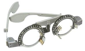 試鏡架是驗光配鏡的基本工具之一,每次插片驗光都必須用到它。它具有一個眼鏡架式的框架,在框架兩個圓圈的正面各配設兩個試鏡坐腳。試鏡架是在綜合驗光儀進行主覺驗光之后使用的,雖然綜合驗光儀得到的結果已經較準確,但還必須再用試鏡架技術進行適當的調整,因為試鏡架比綜合驗光儀更接近于實際佩戴情形。